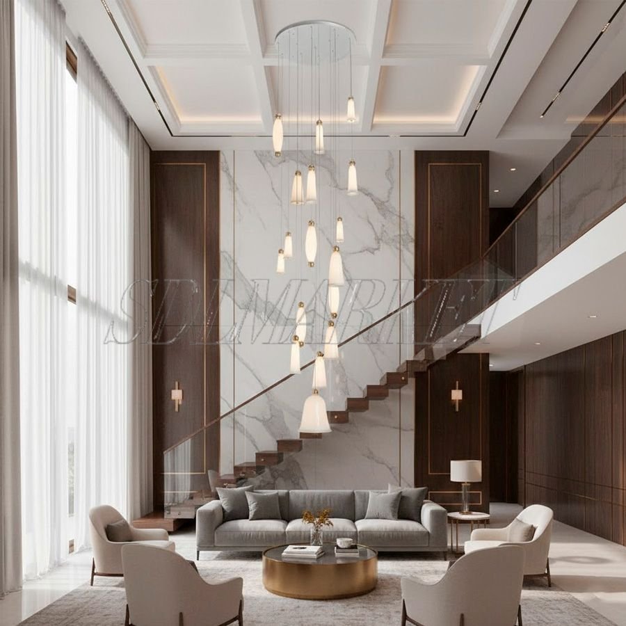 Эта величественная каскадная люстра диаметром 1000 мм и высотой 5000 мм создана для акцентного освещения лестничных пролетов и гостиных со вторым светом в стиле Soft Minimalism или Modern Luxury. Модель выполнена из нержавеющей стали с износостойким гальванопокрытием, а её уникальный визуальный характер формируют элементы из хрустальных изогнутых трубок и мягко сияющего белого нефритового стекла. При мощности 270 Вт и высоком индексе цветопередачи CRI ≥ 90 люстра обеспечивает безупречный теплый свет (3000 К), сохраняя естественные оттенки в премиальных интерьерах. Команда SDLmarket обеспечивает профессиональную комплектацию объектов, включая полную логистику и страхование груза при прямых поставках с фабрик Китая под контракт.