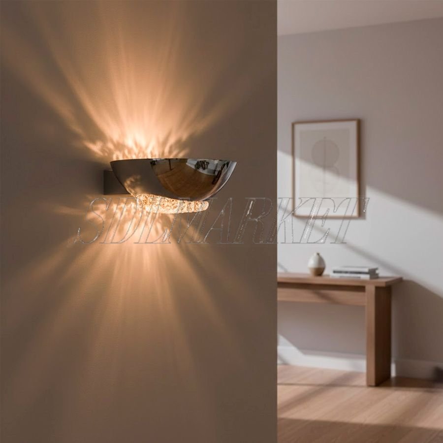 Настенное бра из коллекции Angel"s Eyes (артикул VL0130-011) станет изысканным дополнением к основному освещению, привнося в интерьер атмосферу современного люкса и камерности. Модель выполнена в эффектном сочетании зеркального хрома и фактурной серебряной фольги, а нижняя часть чаши инкрустирована высококачественным боросиликатным стеклом (K9 Crystal), которое создает мягкое, переливающееся свечение. Благодаря компактным размерам (L260*W230 мм) и лаконичной форме, напоминающей драгоценную чашу, этот светильник идеально подходит для акцентного оформления прикроватных зон, коридоров или гостиных в стиле неоклассика и ар-деко, обеспечивая комфортный теплый свет с температурой 3000 К.