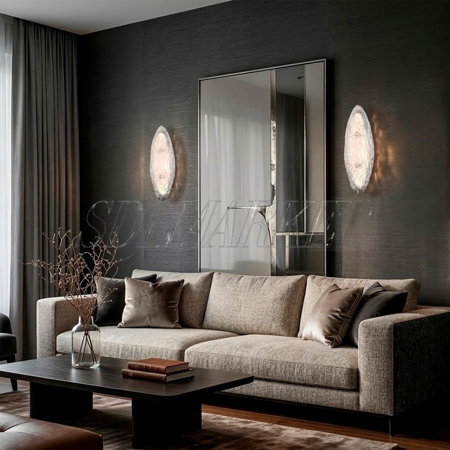 Настенный светильник Glitter MC0080-015 — это изысканный арт-объект, в котором функциональность встречается с природной эстетикой стекла ручной работы. Благодаря компактной овальной форме и уникальной «ледяной» фактуре, бра создает мягкое, рассеянное свечение, превращая обычную стену в подсвеченное полотно. Основание из высококачественной нержавеющей стали с гальваническим покрытием в цвете зеркальный хром подчеркивает чистоту стекла и обеспечивает долговечность изделия. С цветовой температурой 3000 К и высоким индексом цветопередачи CRI ≥ 90, светильник наполняет пространство уютным, естественным светом, который идеально подходит для акцентного освещения. Компактные размеры (W130*H300 мм) позволяют гармонично вписать модель в камерные интерьеры спален, кабинетов или использовать как декоративный элемент в длинных холлах.