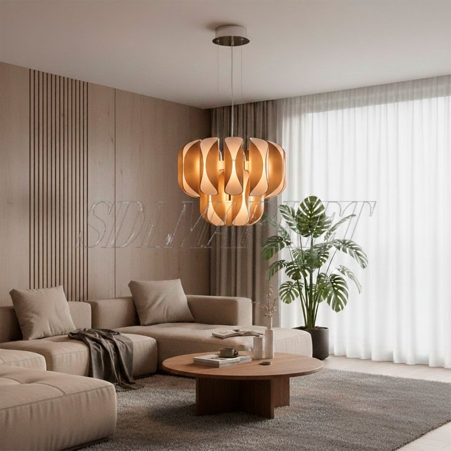 Эта роскошная каскадная люстра, выполненная в теплых золотистых тонах, станет изысканным визуальным центром вашей лаунж-зоны или гостиной. Благодаря высокому индексу цветопередачи (CRI ≥ 90) и мягкой цветовой температуре 3000 К, светильник создает максимально естественное и уютное освещение, которое подчеркивает фактуру премиальных материалов отделки и дарит ощущение комфорта. Многослойная конструкция из изящно изогнутых элементов формирует уникальный световой рисунок, превращая обычное пространство в стильный современный интерьер с атмосферой спокойствия и благородства.