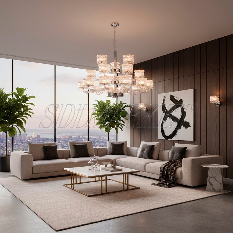 Коллекция Glow в цвете хром — это воплощение изысканного стиля Modern Luxury, созданное для тех, кто ценит благородные материалы и безупречное качество исполнения. Корпус светильников выполнен из высококачественной нержавеющей стали с износостойким гальванопокрытием, а уникальное сочетание рифленых хрустальных трубок и ограненных кристаллов K9 создает завораживающую игру света, наполняя пространство роскошным сиянием. Благодаря комфортной цветовой температуре 3000 К и высокому индексу цветопередачи (CRI ≥ 90), эти люстры и бра обеспечивают максимально естественное и мягкое освещение, идеально подчеркивающее фактуры интерьера.