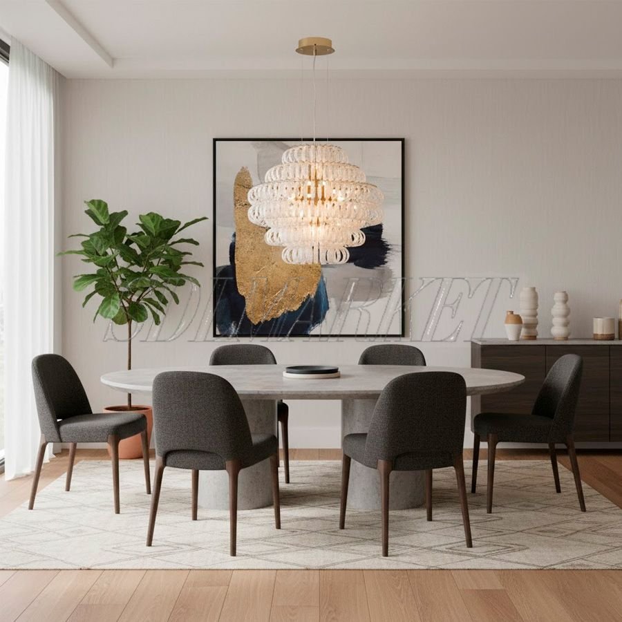 Дизайнерская подвесная люстра из эксклюзивной коллекции Halo Glass в цвете хром представляет собой гармоничный симбиоз индустриальной прочности и художественного изящества. Корпус из высококачественной нержавеющей стали с долговечным гальванопокрытием служит надежной основой для каскада элементов из стекла ручной работы, которые создают неповторимую игру бликов. Модель оснащена 23 лампами с цоколем G9 суммарной мощностью 70 Вт, обеспечивающими комфортное освещение с теплой цветовой температурой 3000 К. Благодаря высокому индексу цветопередачи ≥ 90, светильник сохраняет естественную сочность красок интерьера, а выверенные габариты (диаметр 800 мм, высота 650 мм) позволяют выигрышно разместить его в гостиной или столовой. Купить люстру Halo Glass — значит наполнить пространство мягким сиянием и подчеркнуть безупречный вкус владельца.