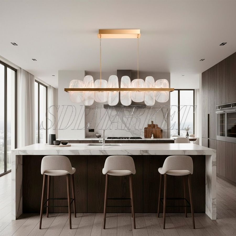 Линейная подвесная люстра MC0190-005 длиной 1200 мм — это флагманское решение для вытянутых пространств, воплощающее концепцию единства льда и пламени. Основание выполнено из высококачественной нержавеющей стали с гальваническим покрытием в изысканном оттенке «зеркальное золото цвета шампанского». Декоративные элементы из стекла ручной работы мягко рассеивают свет, имитируя текстуру подтаявшего льда, сквозь который пробивается уютное тепло. Высокий индекс цветопередачи CRI ≥ 90 гарантирует, что цвета в интерьере и блюда на столе будут выглядеть максимально естественно.