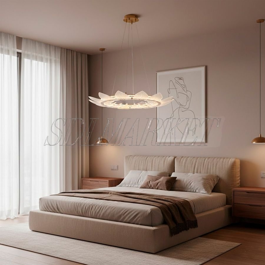 Дизайнерские светильники Luma — это симбиоз природной органики и передовых технологий освещения. Подвесные люстры в оттенке «матовое золото шампань» выполнены из высококачественного алюминия с долговечным гальваническим покрытием, что гарантирует сохранность премиального внешнего вида на десятилетия. Главным акцентом коллекции являются декоративные элементы из стекла ручной работы, имитирующие нежные лепестки, которые мягко рассеивают свет. Благодаря встроенным LED-модулям с цветовой температурой 3000 K и высоким индексом цветопередачи CRI ≥ 90, коллекция Luma создает визуально комфортную среду, сохраняя естественные оттенки интерьера и подчеркивая фактуру премиальных материалов.