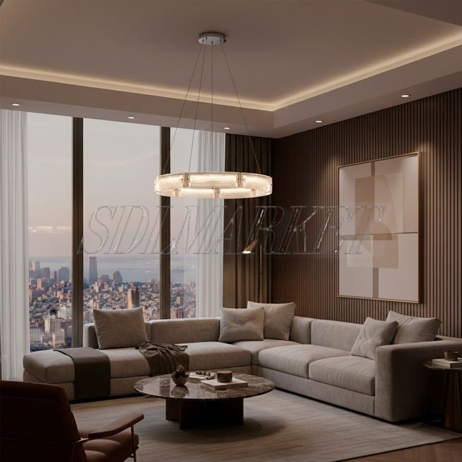 Элегантная кольцевая люстра из коллекции Spark диаметром 800 мм станет изысканным центром современного интерьера, сочетая в себе строгость хромированной нержавеющей стали и уникальную фактуру художественного стекла ручной работы. Гальваническое покрытие корпуса обеспечивает безупречный зеркальный блеск, а декоративные вставки из рифленого стекла мягко преломляют свет, создавая уютную атмосферу и эффектные блики на стенах. Мощность 87 Вт и теплый спектр 3000K в сочетании с высоким индексом цветопередачи CRI ≥ 90 гарантируют качественное и комфортное для глаз освещение, сохраняющее естественность всех оттенков в помещении. Благодаря лаконичной форме и премиальным материалам, эта модель идеально подходит для гостиных, столовых зон и спален, оформленных в стиле неоклассика, минимализм или ар-деко.