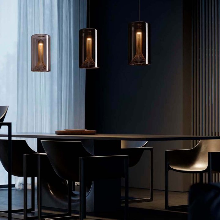 Дизайн этих светильников заключается в том, чтобы материализовать свет и показать форму света через провод. Лампа разделена на внутреннюю и внешнюю части. Внешняя часть представляет собой геометрический стеклянный абажур. Внутренний провод символизирует свет. Источник света освещает металлический контур и стеклянный абажур соответственно, формируя двойное ощущение света.